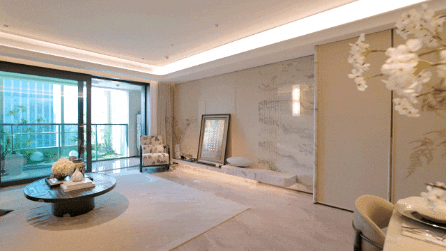 电视布景墙采用卡慕白的石材+皮革制型,是徐汇滨江的1.0阶段。